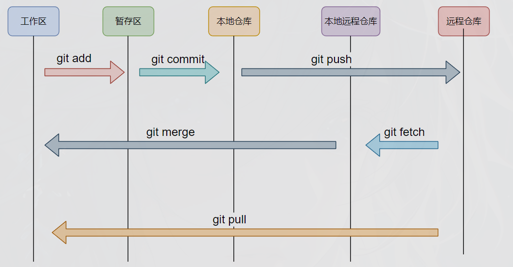 🐼 上述的流程图中,就将git提交时的分区及对应的git命令列出。要注意的是:本地远程仓库相当于远程仓库在本地的镜像,而当我们每一次pull/fetch时,本地远程仓库都会和远程仓库保持同步
