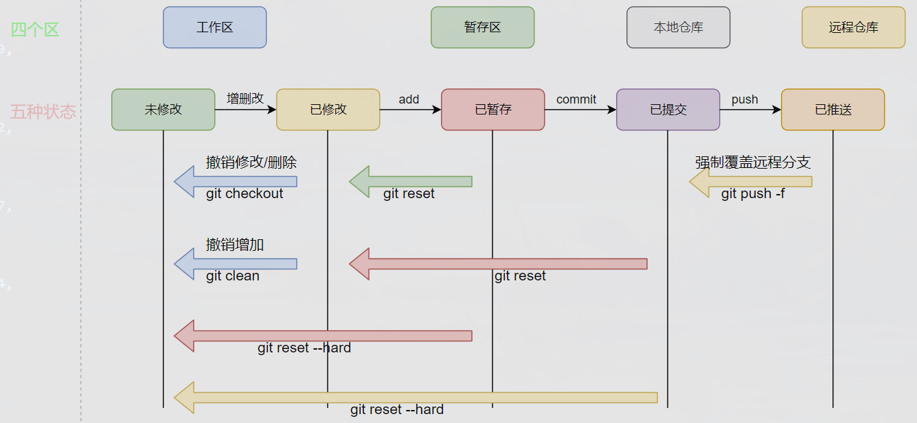 🐼 同提交时的五个分区不同,撤销仅存在四个分区,但是又分别有着五个不同的状态:未修改,已修改,已暂存,已提交,已推送。在这五种状态中,如想要撤销代码提交,分别有着不同的git命令操作。